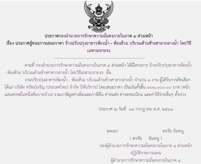 ประกาศผู้ชนะการเสนอราคา จ้างปรับปรุงอาคารห้องน้ำ – ห้องส้วม บริเวณด้านข้างศาลากลางน้ำ โดยวิธีเฉพาะเจาะจง ( ๑๖๑,๐๐๐.๐๐ บาท )