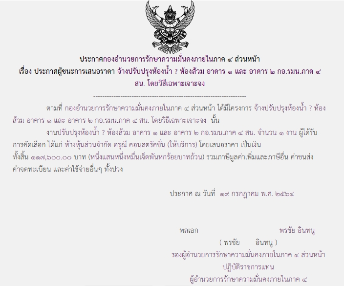 จัดซื้อ จัดจ้างประกาศผู้ชนะการเสนอราคา ประกาศผู้ชนะการเสนอราคา จ้างปรับปรุงห้องน้ำ – ห้องส้วม อาคาร ๑ และ อาคาร ๒ กอ.รมน.ภาค ๔ สน. โดยวิธีเฉพาะเจาะจง ( ๑๑๗,๖๐๐.๐๐ บาท ) July 26, 2021 524 Share Facebook Twitter Google+ Telegram LINE กอ.รมน.ภาค ๔ สน.