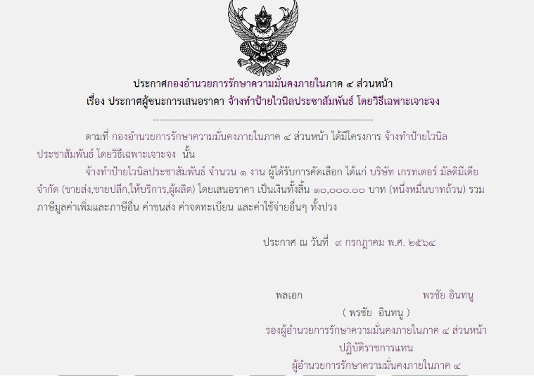 ประกาศผู้ชนะการเสนอราคา จ้างทำไวนิลประชาสัมพันธ์ โดยวิธีเฉพาะเจาะจง ( ๑๐,๐๐๐.๐๐ บาท )