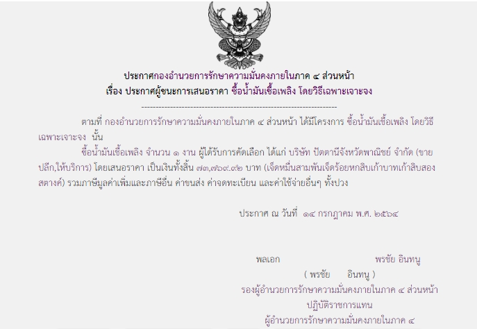ประกาศผู้ชนะการเสนอราคา ซื้อน้ำมันเชื้อเพลิง โดยวิธีเฉพาะเจาะจง ( ๗๓,๗๖๙.๙๒ บาท )
