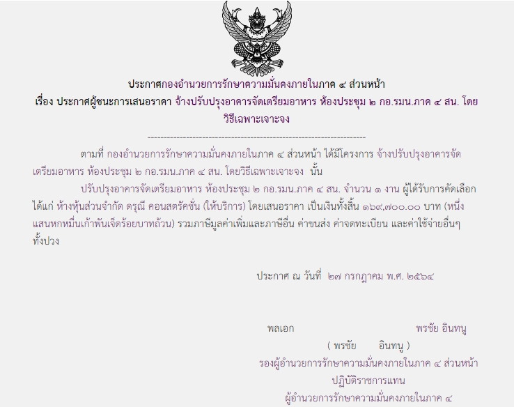ประกาศผู้ชนะการเสนอราคา จ้างปรับปรุงอาคารจัดเตรียมอาหาร ห้องประชุม ๒ กอ.รมน.ภาค ๔ สน. โดยวิธีเฉพาะเจาะจง ( ๑๖๙,๗๐๐.๐๐ บาท )