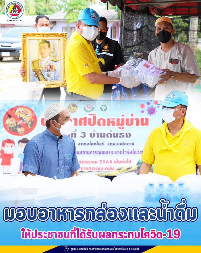 ที่ หมู่ที่ 3 บ้านต้นธง ตำบลโคกโพธิ์ อำเภอโคกโพธิ์ จังหวัดปัตตานี พลตรีคมกฤช รัตนฉายา ผู้บังคับหน่วยเฉพาะกิจปัตตานี ร่วมกิจกรรม “มีแล้วแบ่งปัน” มอบอาหารกล่อง และน้ำดื่มให้กับประชาชนในพื้นที่ หลังมีประกาศปิดหมู่บ้านชั่วคราว เพื่อเป็นการป้องกัน เฝ้าระวัง และควบคุมการแพร่ระบาดของโรคโควิด-19 ซึ่งทำให้ประชาชนได้รับความเดือดร้อน การมอบครั้งนี้ได้มอบผ่านผู้แทนหมู่บ้าน ส่งต่อไปยังพี่น้องประชาชน พร้อมมอบหน้ากากอนามัย เพื่อให้ประชาชนไว้ใช้ในการป้องกันตนเองจากเชื้อโควิด-19 โดยมี ผู้บังคับหน่วยเฉพาะกิจกรมทหารพรานที่ 43, ผู้นำศาสนา, ผู้นำชุมชนในพื้นที่ และ ชุดปฏิบัติการกิจการพลเรือน หน่วยเฉพาะกิจกรมทหารพรานที่ 43 ทั้งนี้เนื่องในวันที่ 28 ก.ค. เป็นวันคล้ายวันพระบรมราชสมภพพระบาทสมเด็จพระเจ้าอยู่หัวทรงเจริญพระชนมพรรษา 69 พรรษา เพื่อเป็นการแสดงออกถึงความจงรักภักดีและสำนึกในพระมหากรุณาธิคุณต่อสถาบันพระมหากษัตริย์ที่มีต่อพสกนิกร