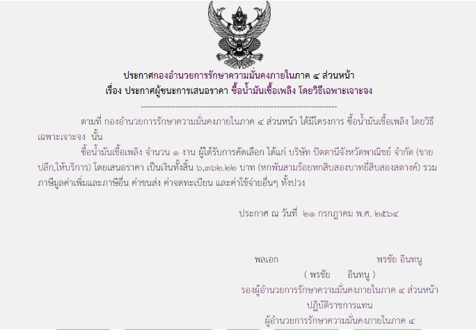 ประกาศผู้ชนะการเสนอราคา ซื้อน้ำมันเชื้อเพลิง โดยวิธีเฉพาะเจาะจง ( ๖,๓๖๒.๒๒ บาท )