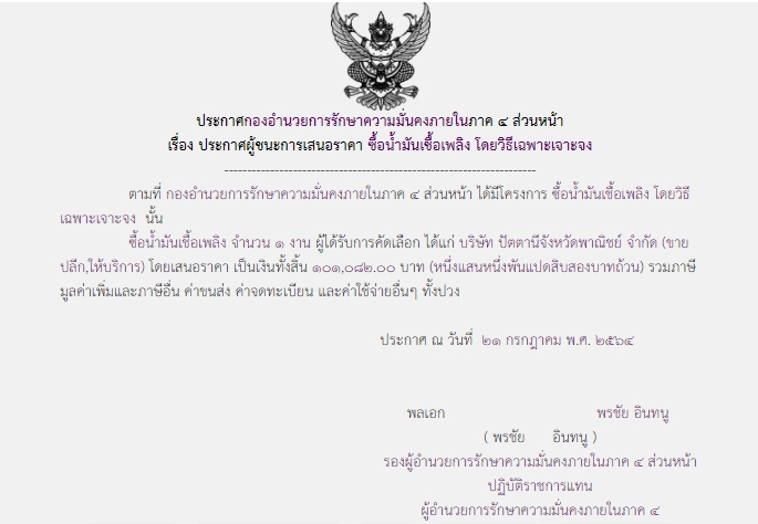 ประกาศผู้ชนะการเสนอราคา ซื้อน้ำมันเชื้อเพลิง โดยวิธีเฉพาะเจาะจง ( ๑๐๑,๐๘๒.๐๐ บาท )