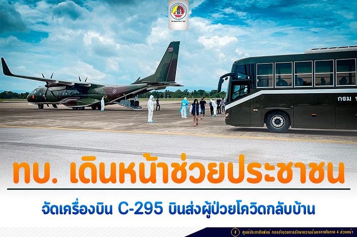 สำหรับการลำเลียงผู้ป่วยทางอากาศกลับภูมิลำเนา โดยใช้เครื่องบินของกองทัพบกในการส่งผู้ป่วย ได้ริ่มดำเนินการมาตั้งแต่วันที่ 29 ก.ค. 64 ทำการเคลื่อนย้ายผู้ป่วย COVID-19 ที่ไม่มีอาการ(สีเขียว) จำนวน 40 คน 2 เที่ยวบิน จาก กทม.ปลายทางสนามบินนครพนม และ วันที่ 30 ก.ค.64 จำนวน 24 คน 1 เที่ยวบิน ปลายทาง จ.น่าน โดยใช้เครื่องบินลำเลียงแบบ C-295 พร้อมทีมแพทย์เวชศาสตร์การบิน โดยผู้ป่วยตลอดจนญาติ และครอบครัว ได้แสดงความขอบคุณกองทัพบกและเจ้าหน้าที่ทุกส่วนที่ช่วยประสานงานและอำนวยความสะดวกการเดินทางจนได้กลับถึงบ้านอย่างเรียบร้อย