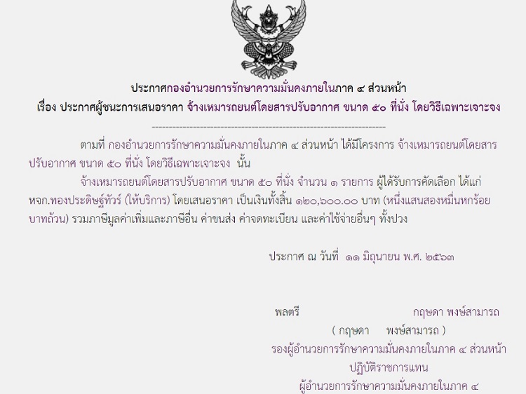 ประกาศผู้ชนะการเสนอราคา จ้างเหมารถยนต์โดยสารปรับอากาศ ขนาด 50 ที่นั่ง โดยวิธีเฉพาะเจาะจง (120,600.00)
