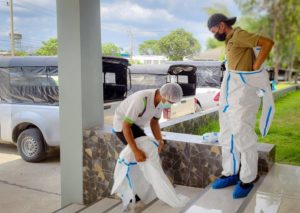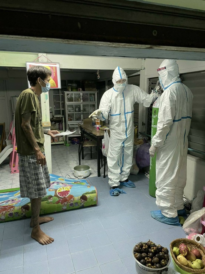 เมื่อสวมชุด PPE แล้วจะถอดได้ก็ต่อเมื่อเสร็จภารกิจ กลับมายังหน่วย และฉีดพ่นฆ่าเชื้อทั้งคนและรถ วันนี้เพียงครึ่งวันช่วงเช้า น้องๆ เล่าว่าวิ่ง รับ – ส่ง ผู้ป่วยโควิด-19 มาแล้วกว่า 5 เที่ยว กว่าจะจบงานก็ปาไปเกือบ บ่าย 2 โมง ข้าวเช้า ข้าวเที่ยง จึงต้องรวมเป็นมื้อเดียวกัน น้องๆ เจ้าหน้าที่ทหารเหล่านี้ ทำหน้าที่แบบนี้ทุกวัน มากว่า 4 เดือนแล้ว นับตั้งแต่ 27 พ.ค. 64 วิ่งรับ – ส่ง นับหมื่นเที่ยว ต้องแยกจากครอบครัว มาพักอยู่ภายในหน่วยตลอดภารกิจเพื่อความปลอดภัย ทุกคนเสียสละ อดทน เพื่อคนที่เขารัก