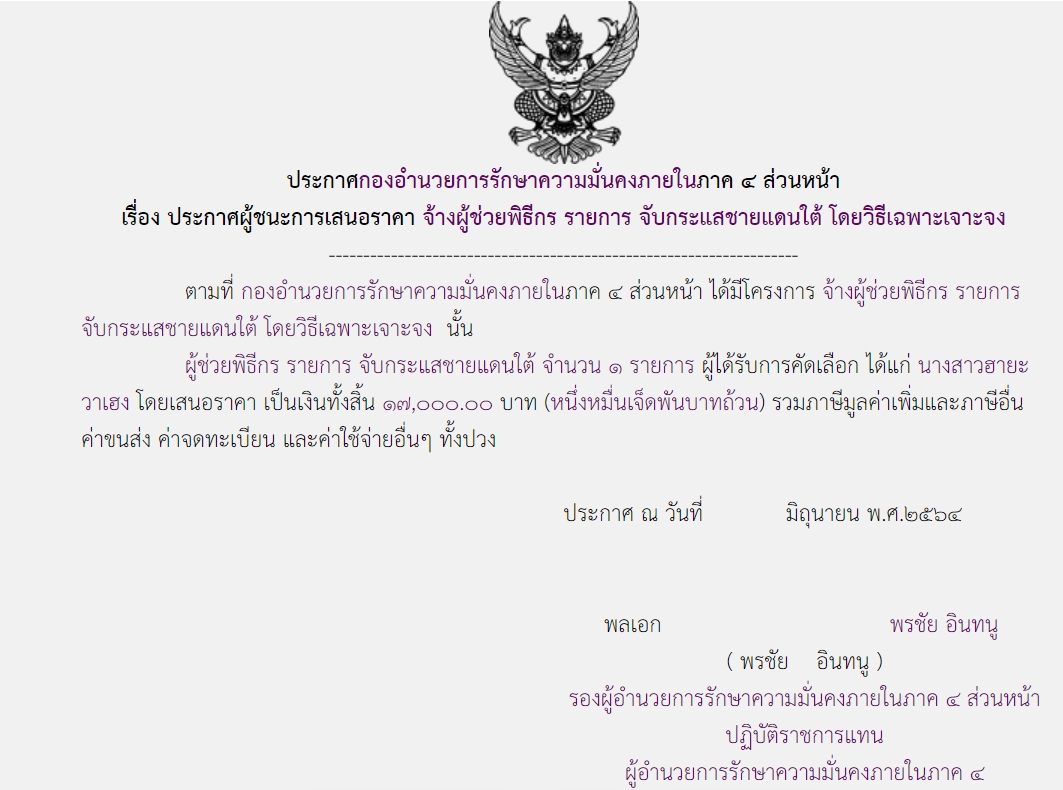 จัดซื้อ จัดจ้างประกาศผู้ชนะการเสนอราคา ประกาศผู้ชนะการเสนอราคา จ้างผู้ช่วยพิธีกร รายการ จับกระแสแดนใต้ โดยวิธีเฉพาะเจาะจง ( ๑๗,๐๐๐.๐๐ บาท ) August 1, 2021 578 Share Facebook Twitter Google+ Telegram LINE กอ.รมน.ภาค ๔ สน.
