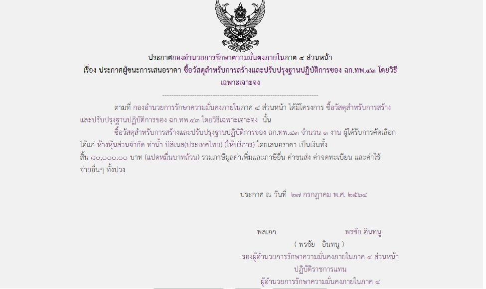 ประกาศผู้ชนะการเสนอราคา ซื้อวัสดุสำหรับการสร้างและปรับปรุงฐานปฏิบัติการของ ฉก.ทพ.๔๓ โดยวิธีเฉพาะเจาะจง ( ๘๐,๐๐๐.๐๐ บาท )