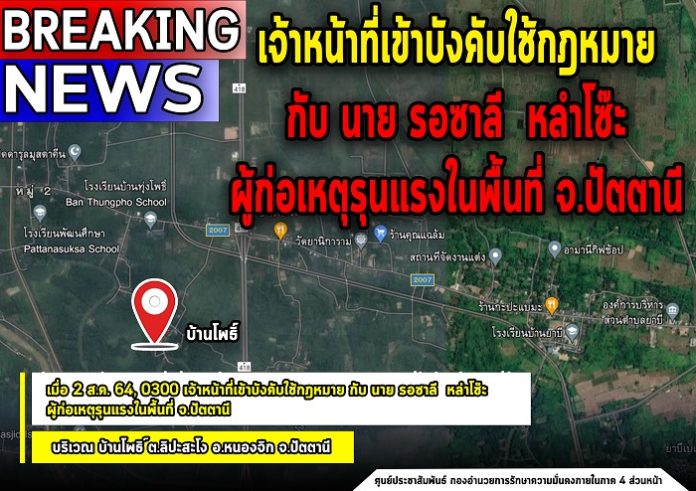 เมื่อช่วงเช้าวันนี้ (2 สิงหาคม 2564 เวลา 03.00 น.) เจ้าหน้าที่เข้าบังคับใช้กฎหมาย กับนายรอซาลี หลำโซ๊ะ ผู้ก่อเหตุรุนแรงในพื้นที่ จังหวัดปัตตานี ที่บริเวณ บ้านโพธิ์ ตำบลลิปะสะโง อำเภอหนองจิก จังหวัดปัตตานี