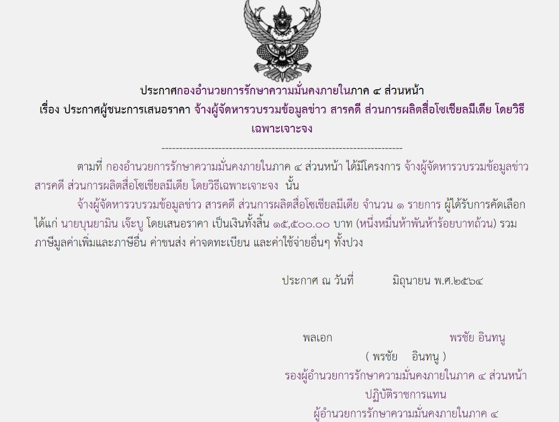 ประกาศผู้ชนะการเสนอราคา จ้างผู้จัดหารวบรวมข้อมูลข่าว สารคดี ส่วนการผลิตสื่อโซเชียลมีเดีย โดยวิธีเฉพาะเจาะจง ( ๑๕,๕๐๐.๐๐ บาท )