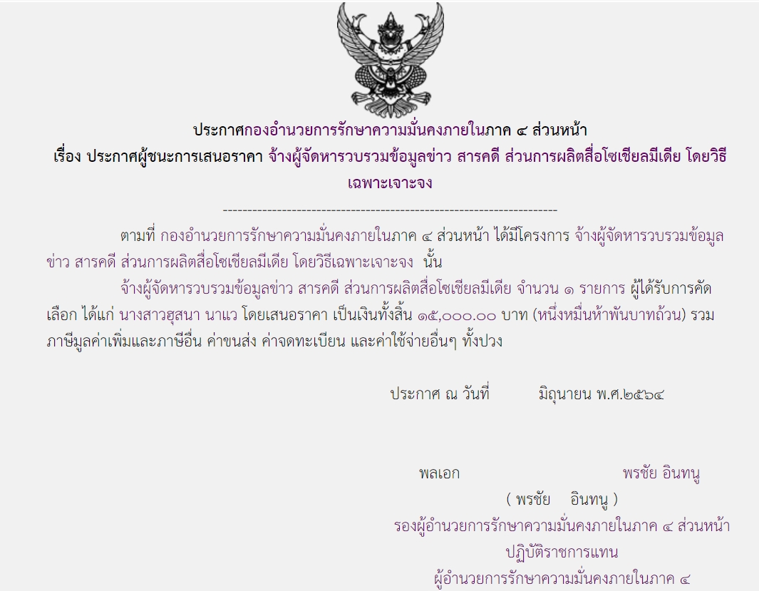 ประกาศผู้ชนะการเสนอราคา จ้างผู้จัดหารวบรวมข้อมูลข่าว สารคดี ส่วนการผลิตสื่อโซเชียลมีเดีย โดยวิธีเฉพาะเจาะจง ( ๑๕,๐๐๐.๐๐ บาท )
