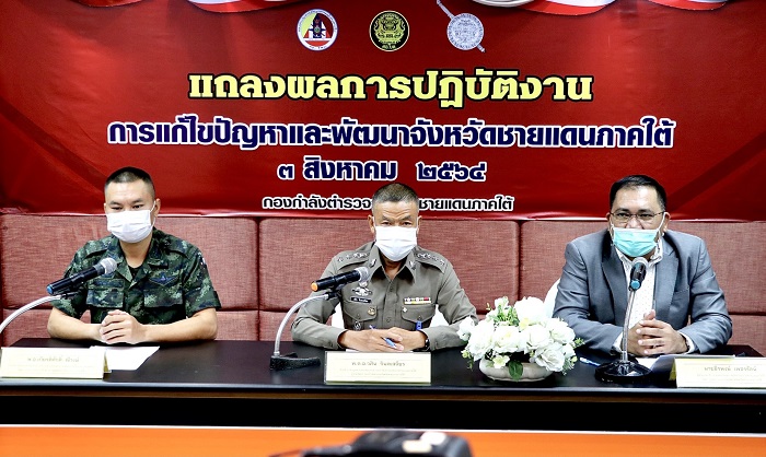 วันนี้ ( 3 สิงหาคม 2564 ) เวลา 09.00 น. ที่ห้องประชุมดาหลา กองกำลังตำรวจจังหวัดชายแดนภาคใต้ อำเภอเมือง จังหวัดยะลา พันเอกเกียรติศักดิ์ ณีวงษ์ โฆษกกองอำนวยการรักษาความมั่นคงภายในภาค 4 ส่วนหน้าพร้อมด้วย พันตำรวจเอกวศิน จินตเสถียร ผู้กำกับการ (สอบสวน) กองกำลังตำรวจจังหวัดชายแดนภาคใต้ / ผู้ช่วยโฆษกกองกำลังตำรวจจังหวัดชายแดนภาคใต้ และนายธีรพงษ์ เพชรรัตน์ ผู้ช่วยเลขาธิการศูนย์อำนวยการบริหารจังหวัดชายแดนภาคใต้ / โฆษกศูนย์อำนวยการบริหารจังหวัดชายแดนภาคใต้ ร่วมแถลงข่าวชี้แจงผลการปฏิบัติงานในห้วงเดือนที่ผ่านมา
