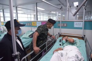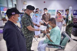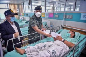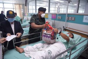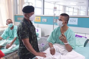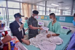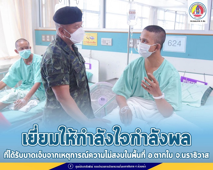 วันนี้ 3 สิงหาคม 2564 เวลา 09.00 น. ณ โรงพยาบาลสุไหงโกลก อำเภอสุไหงโกลก จังหวัดนราธิวาส พลโท เกรียงไกร ศรีรักษ์ แม่ทัพภาคที่ 4 /ผู้อำนวยการรักษาความมั่นคงภายในภาค 4 พร้อมด้วยนายไพโรจน์ จริตงาม รองผู้ว่าราชการจังหวัดนราธิวาส เดินทางเยี่ยมอาการบาดเจ็บ จ่าสิบเอก กฤษฎา แซ่บุ๋น , อาสาสมัครทหารพราน มานะ เร็วสูงเนิน, อาสาสมัครทหารพราน วุฒินันท์ ภารกิจ และ อาสาสมัครทหารพราน วิทวัฒน์ อินทะนะนก กำลังพลสังกัดกองร้อยทหารพรานที่ 4514 หน่วยเฉพาะกิจกรมทหารพรานที่ 45 ซึ่งได้รับบาดเจ็บจากเหตุคนร้ายไม่ทราบจำนวนใช้อาวุธปืนยิงลูกระเบิดแบบเอ็ม 79 เข้าใส่ฐานปฏิบัติการ ชุดปฏิบัติการจรยุทธ์ บริเวณบ้านแฆแบะ ตำบลนานาค อำเภอตากใบ ซึ่งเป็นเขตรอยต่อกับบ้านปาดังยอ หมู่ที่ 3 ตำมูโนะ อำเภอสุไหงโก-ลก จังหวัดนราธิวาส ขณะปฏิบัติภารกิจลาดตระเวนป้องกันการลักลอบเข้าเมืองผิดกฎหมายตามแนวชายแดนไทย – มาเลเซีย โดยแรงระเบิดทำให้เจ้าหน้าที่ชุดปฏิบัติการประยุทธ์ ได้รับบาดเจ็บ จำนวน 4 นาย และเสียชีวิต จำนวน 1 นาย ทราบชื่อ อาสาสมัครทหารพราน เกียรติขจร นาคดี เมื่อวันที่ 3 สิงหาคม 2564 เวลา 02.30 น. ที่ผ่านมา โดยแม่ทัพภาคที่ 4 ได้สอบถามอาการ และเหตุการณ์ที่เกิดขึ้น พร้อมทั้งนำความห่วงใย และความเสียใจจาก พลเอก ณรงค์พันธ์ จิตต์แก้วแท้ ผู้บัญชาการทหารบกมายังกำลังพลเจ้าหน้าที่หน่วยเฉพาะกิจกรมทหารพรานที่ 45 และครอบครัวผู้สูญเสีย ชื่นชมในความกล้าหาญของกำลังพลที่ทุ่มเทและเสียสละในภารกิจอย่างสุดกำลังความสามารถ ขอให้มีขวัญ และกำลังใจที่ดี กลับมาปฏิบัติหน้าที่ต่อไป ต่อจากนี้ให้หน่วยต้นสังกัดดูแลเรื่องสิทธิและสวัสดิการโดยเร็วและครบถ้วนตามสิทธิ นอกจากนี้ยังได้สั่งการให้เจ้าหน้าที่เร่งรวบรวมวัตถุพยานต่าง ๆ เน้นย้ำให้ทุกพื้นที่เพิ่มความระมัดระวังและความเข้มงวด ประสานกำลังทุกภาคส่วนรักษาความปลอดภัยในพื้นที่ให้มีประสิทธิภาพมากยิ่งขึ้น ปรับกลยุทธพลิกแพลงอย่างรู้เท่าทัน เพื่อสร้างความเชื่อมั่นให้กับพี่น้องประชาชน อย่างไรก็ตามขอความร่วมมือประชาชนในพื้นที่ หากพบเห็นสิ่งผิดปกติ หรือบุคคลต้องสงสัยเข้ามาเคลื่อนไหวในพื้นที่ สามารถแจ้งได้ที่เบอร์สายตรงแม่ทัพภาคที่ 4 โทร 061-1732999 และเบอร์สายด่วน 1341 หรือหน่วยเฉพาะกิจในพื้นที่ได้ตลอด 24 ชั่วโมง