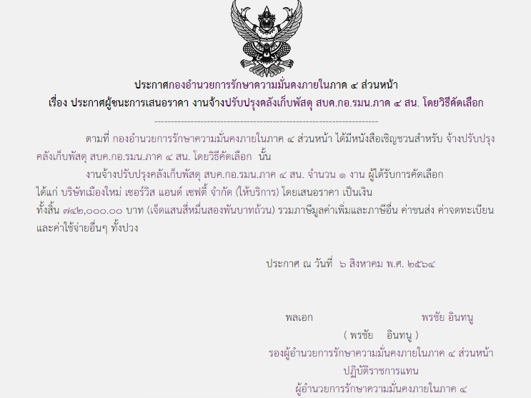 จัดซื้อ จัดจ้างประกาศผู้ชนะการเสนอราคา ประกาศผู้ชนะการเสนอราคา งานจ้างปรับปรุงคลังเก็บพัสดุ สบค.กอ.รน.ภาค ๔ สน. โดยวิธีคัดเลือก ( ๗๔๒,๐๐๐.๐๐ บาท ) August 4, 2021 618 Share Facebook Twitter Google+ Telegram LINE กอ.รมน.ภาค ๔ สน.