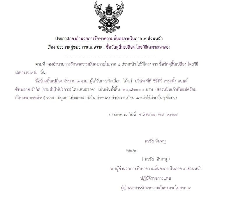 จัดซื้อ จัดจ้างประกาศผู้ชนะการเสนอราคา ประกาศผู้ชนะการเสนอราคา ซื้อวัสดุสิ้นเปลือง โดยวิธีเฉพาะเจาะจง ( ๒๙,๘๒๓.๐๐ บาท ) August 5, 2021 561 Share Facebook Twitter Google+ Telegram LINE กอ.รมน.ภาค ๔ สน.