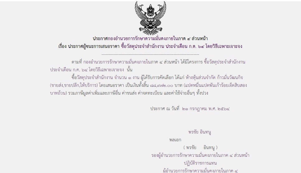 ประกาศผู้ชนะการเสนอราคา ซื้อวัสดุประจำสำนักงาน ประจำเดือน ก.ค.๖๔ โดยวิธีเฉพาะเจาะจง ( ๘๘,๙๗๒.๐๐ บาท )