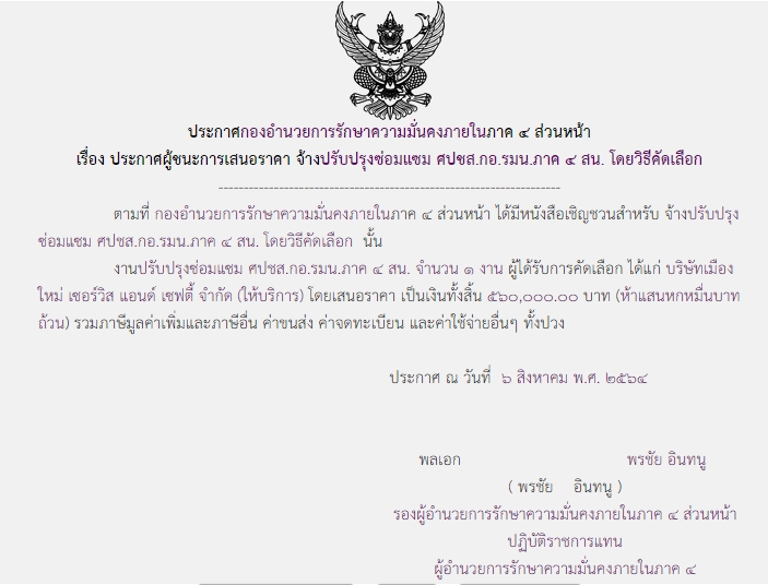 ประกาศผู้ชนะการเสนอราคา จ้างปรับปรุงซ่อมแซม ศปชส.กอ.รมน.ภาค ๔ สน.โดยวิธีคัดเลือก ( ๕๖๐,๐๐๐.๐๐ บาท )