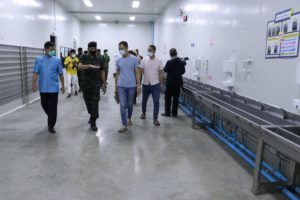 พลตรี ศานติ ศกุลตนาค ผู้บังคับหน่วยเฉพาะกิจสงขลา กล่าวว่า วันนี้หน่วยเฉพาะกิจสงขลาและนายอำเภอเทพา ได้มาตรวจเยี่ยมบริษัมม่านกู่หวาง ฟู๊ด จำกัด ซึ่งเป็นบริษัทที่รับซื้อทุเรียนสดจากชาวบ้านและประชาชนในพื้นที่ 3 จังหวัด ยะลา ปัตตานี นราธิวาส และ 4 อำเภอของจังหวัดสงขลา เพื่อนำมาแพคบรรจุกล่อง ส่งไปยังประเทศจีน วันนี้เรามาดูว่าเกษตรกรชาวสวนที่จะนำทุเรียนมาส่งให้บริษัทจะต้องปฏิบัติอย่างไร ให้สอดรับสถานการณ์ Covid – 19 พร้อมกันนี้ผู้บังคับหน่วยเฉพาะกิจสงขลา ได้สร้างความมั่นใจแก่เกษตรกรชาวสวนที่จะนำทุเรียนมาขายให้กับบริษัทม่านกู่หวาง ฟู๊ด จำกัด ว่าทางบริษัทฯ มีมาตรการป้องกัน Covid – 19 อย่างเข้มงวด ทั้งจุดคัดกรอง ตรวจวัดอุณหภูมิร่างกาย จุดล้างมือ และตามจุดบริการต่างๆ ตาม สบค.กำหนดอย่างเคร่งครัด
