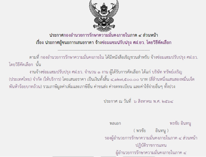 ประกาศผู้ชนะการเสนอราคา จ้างซ่อมแซมปรับปรุง ศฝ.ยว. โดยวิธีคัดเลือก ( ๔,๑๒๗,๕๐๐.๐๐ บาท )