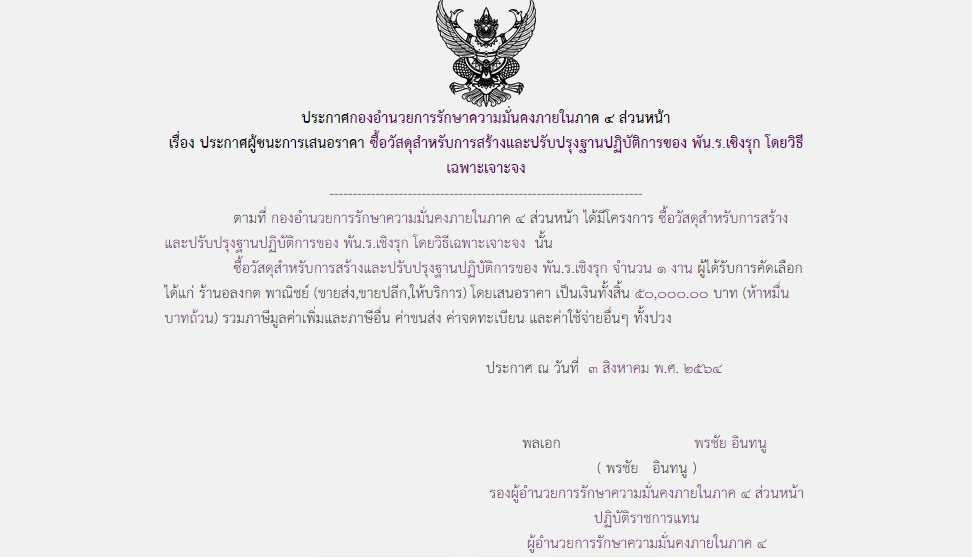 ประกาศผู้ชนะการเสนอราคา ซื้อวัสดุสำหรับการสร้างและปรับปรุงฐานปฏิบัติการของ พัน.ร.เชิงรุก โดยวิธีเฉพาะเจาะจง ( ๕๐,๐๐๐.๐๐ บาท )