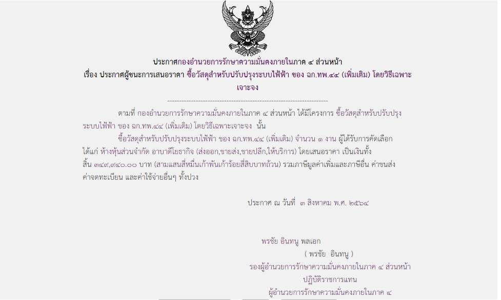 จัดซื้อ จัดจ้างประกาศผู้ชนะการเสนอราคา ประกาศผู้ชนะการเสนอราคา ซื้อวัสดุสำหรับการสร้างและปรับปรุงฐานปฏิบัติการของ ฉก.ทพ.๔๔ ( เพิ่มเติม ) โดยวิธีเฉพาะเจาะจง ( ๓๔๙,๙๔๐.๐๐ บาท ) August 8, 2021 612 Share Facebook Twitter Google+ Telegram LINE กอ.รมน.ภาค ๔ สน.