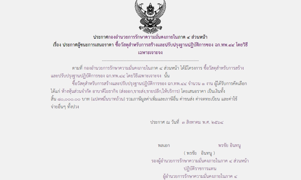 ประกาศผู้ชนะการเสนอราคา ซื้อวัสดุสำหรับการสร้างและปรับปรุงฐานปฏิบัติการของ ฉก.ทพ.๔๔ โดยวิธีเฉพาะเจาะจง ( ๘๐,๐๐๐.๐๐ บาท )