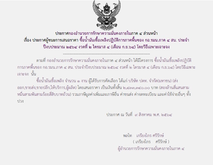จัดซื้อ จัดจ้างประกาศผู้ชนะการเสนอราคา ประกาศผู้ชนะการเสนอราคา ซื้อน้ำมันเชื้อเพลิงปฏิบัติการภาคพื้นของ บก.กอ.รมน.ภาค ๔ สน. ประจำปีงบประมาณ ๒๕๖๔ งวดที่ ๒ ไตรมาส ๔ ( เดือน ก.ย.๖๔ ) โดยวิธีเฉพาะเจาะจง ( ๒,๔๓๓,๓๔๐.๐๐ บาท ) August 9, 2021 518 Share Facebook Twitter Google+ Telegram LINE กอ.รมน.ภาค ๔ สน.