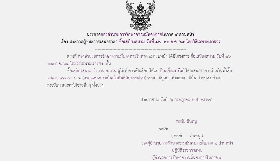 ประกาศผู้ชนะการเสนอราคา ซื้อเสบียงสนาม วันที่ ๑๖ – ๓๑ ก.ค. ๖๔ โดยวิธีเฉพาะเจาะจง ( ๓๒๙,๐๔๐.๐๐ บาท )