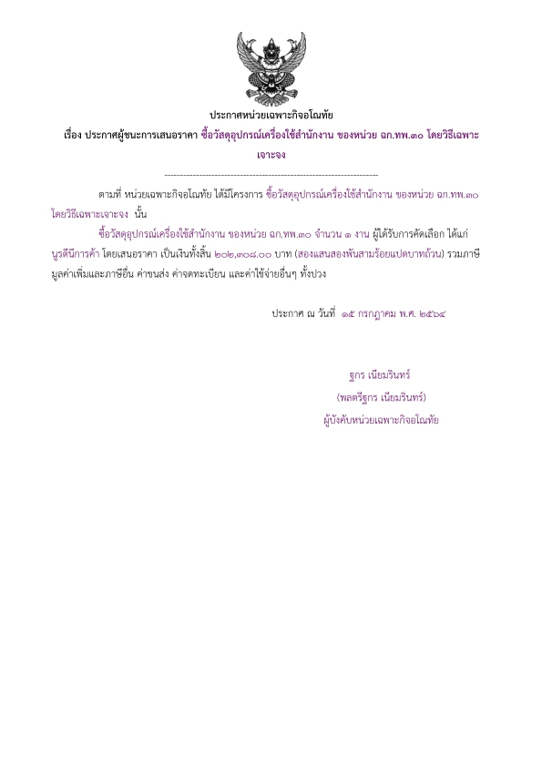 ประกาศผู้ชนะการเสนอราคา ซื้อวัสดุอุปกรณ์เครื่องใช้สำนักงาน ของหน่วย ฉก.ทพ.๓๐ โดยวิธีเฉพาะเจาะจง ( ๒๐๒,๓๐๘.๐๐ บาท )