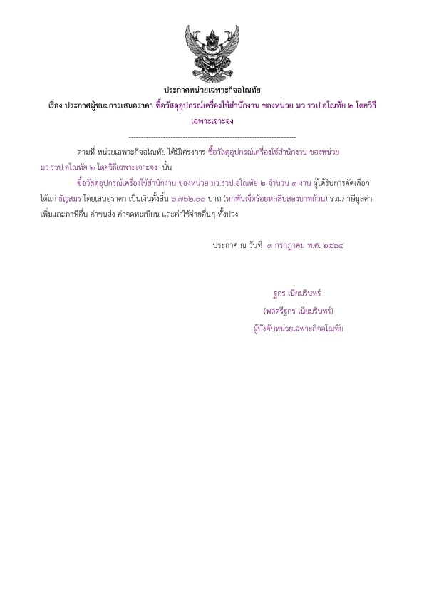 ประกาศผู้ชนะการเสนอราคา ซื้อวัสดุอุปกรณ์เครื่องใช้สำนักงาน ของหน่วย มว.รวป.อโณทัย ๒ โดยวิธีเฉพาะเจาะจง ( ๖,๗๖๒.๐๐ บาท )