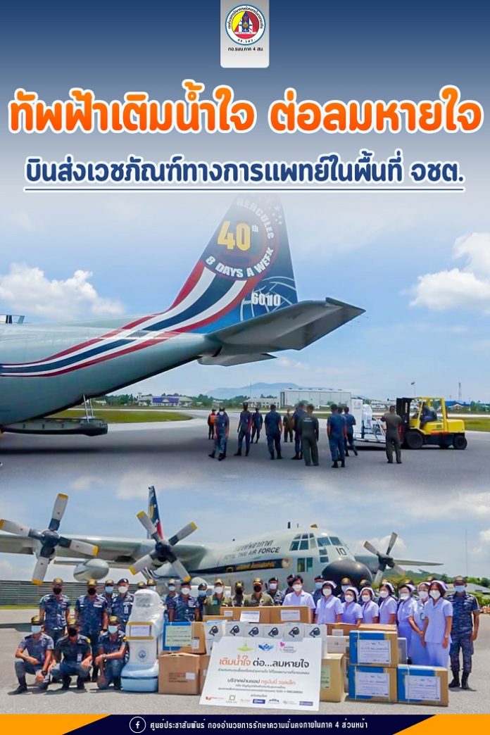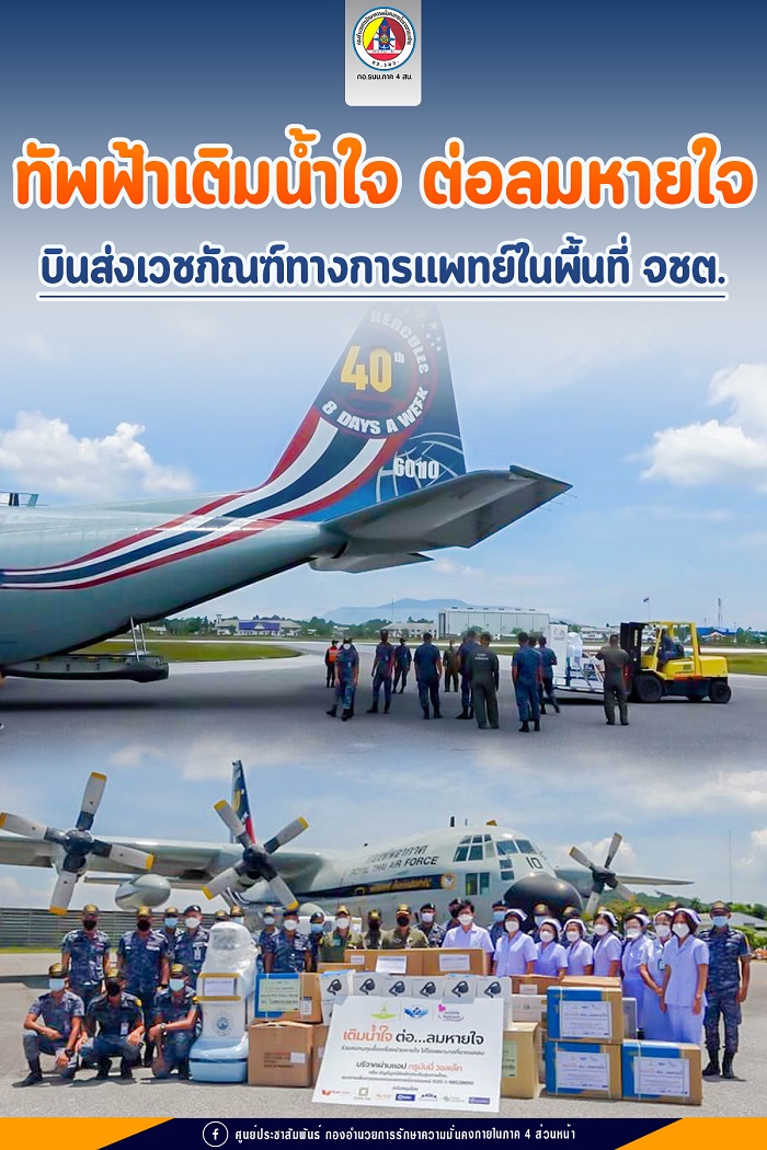 วันที่ 13 สิงหาคม 2564 กองกำลังทางอากาศเฉพาะกิจที่ 9 นำเครื่องบินลำเลียง C-130 ลำเลียงอุปกรณ์ทางการแพทย์ ประกอบด้วย เครื่องช่วยหายใจ High Flow จำนวน 2 เครื่อง, หน้ากาก N95 จำนวน 1,000 ชิ้น, ชุด PPE จำนวน 400 ชุด และอุปกรณ์ปกป้องทางเดินหายใจแบบอากาศบริสุทธิ์ (PAPR) จำนวน 12 เครื่อง รวมมูลค่าทั้งหมด 892,000 บาท จากภารกิจ “เติมน้ำใจ ต่อลมหายใจ” โดยได้ดำเนินการจัดหาอุปกรณ์ทางการแพทย์ที่จำเป็นให้กับโรงพยาบาล ที่ขาดแคลนทั่วประเทศไทยเพื่อบรรเทาความเดือดร้อนของประชาชนและช่วยเหลือผู้ป่วยโรคโควิด – 19 โดยมี พลอากาศเอก แอร์บูล สุทธิวรรณ ผู้บัญชาการทหารอากาศ ในฐานะผู้บัญชาการศูนย์บรรเทา สาธารณภัยกองทัพอากาศ เป็นประธานโครงการ