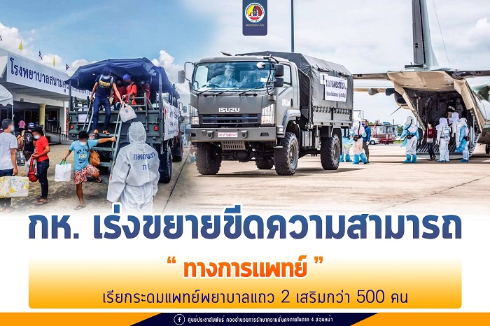 ขณะเดียวกัน กองทัพได้เร่งขยายขีดความสามารถทางการแพทย์ใน โรงพยาบาลทหารแต่ละเหล่าทัพ โดยจัดตั้งห้อง ICU รองรับผู้ป่วยสีแดงเพิ่ม 80 เตียง และผู้ป่วยสีเหลือง 306 เตียง ขณะเดียวกันอยู่ระหว่างเร่งจัดตั้ง โรงพยาบาลสนาม และ CI ในพื้นที่หน่วยทหารทั่วประเทศเพิ่ม ร่วมกับ กระทรวงสาธารณสุขจังหวัด พร้อมกันนี้ ได้เรียกระดมบุคลากรทางการแพทย์แถว 2 กว่า 500 คน เข้ามาเสริมการทำงาน เพื่อรองรับการดูแลประชาชน