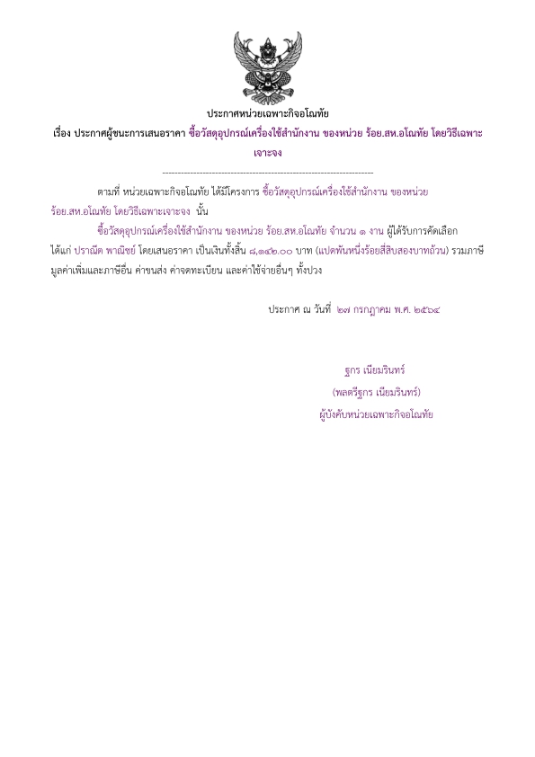 จัดซื้อ จัดจ้างประกาศผู้ชนะการเสนอราคา ประกาศผู้ชนะการเสนอราคา ซื้อวัสดุอุปกรณ์เครื่องใช้สำนักงาน ของหน่วย ร้อย.สห.อโณทัย โดยวิธีเฉพาะเจาะจง ( ๘,๑๔๒.๐๐ บาท ) August 14, 2021 537 Share Facebook Twitter Google+ Telegram LINE ฉก.อโณทัย