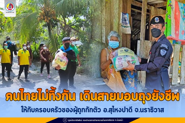 ที่ ตำบลสุไหงปาดี อำเภอสุไหงปาดี จังหวัดนราธิวาส หน่วยเฉพาะกิจกรมทหารพรานที่48 กองร้อยทหารพรานที่ 4805 ร่วมกับ กลุ่มมวลชนญาลันนันบารู สมาพันธ์ไทยพุทธจังหวัดนราธิวาส องค์การบริหารส่วนตำบลสุไหงปาดี และกลุ่มสตรีสุไหงปาดี จัดกิจกรรมตามโครงการคนไทยไม่ทิ้งกัน มอบถุงยังชีพให้กับครอบครัวของบุคคลผู้ถูกกักตัว ภายในตำบลสุไหงปาดี ที่ได้รับความเดือดร้อนจากสถานการณ์การแพร่ระบาดของเชื้อไวรัสโควิด-19 เพื่อช่วยเหลือบรรเทาทุกข์ให้กับประชาชนที่ได้รับผลกระทบจากวิกฤตดังกล่าว และเป็นการช่วยลดภาระค่าใช้จ่ายในครัวเรือนในระหว่างกักตัวของครอบครัวประชาชนที่ต้องกักตัวในพื้นที่ ซึ่งจากกิจกรรมในครั้งนี้ได้รับความร่วมมือร่วมใจจากประชาชนในพื้นที่เป็นอย่างดี หน่วยงานทุกภาคส่วน พร้อมที่จะฝ่าวิกฤติการแพร่ระบาดของเชื้อไวรัสโควิด-19 ไปด้วยกัน