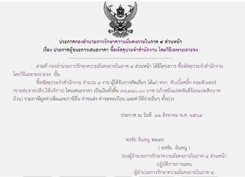 ประกาศผู้ชนะการเสนอราคา ซื้อพัสดุประจำสำนักงาน โดยวิธีเฉพาะเจาะจง ( ๙๘,๔๘๐.๐๐ บาท )