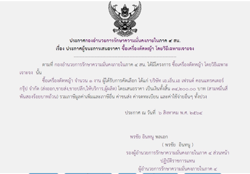 ประกาศผู้ชนะการเสนอราคา ซื้อเครื่องตัดหญ้า โดยวิธีเฉพาะเจาะจง ( ๓๔,๒๐๐.๐๐ บาท )