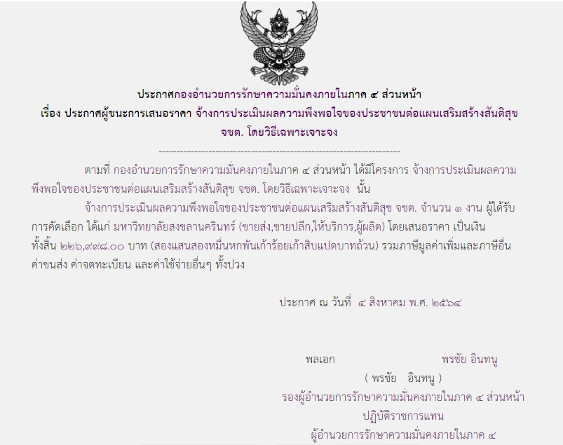 จัดซื้อ จัดจ้างประกาศผู้ชนะการเสนอราคา ประกาศผู้ชนะการเสนอราคา จ้างการประเมินผลความพึงพอใจของประชาชนต่อแผนเสริมสร้างสันติสุข จชต. โดยวิธีเฉพาะเจาะจง ( ๒๒๖,๙๙๘.๐๐ บาท ) August 15, 2021 462 Share Facebook Twitter Google+ Telegram LINE กอ.รมน.ภาค ๔ สน.