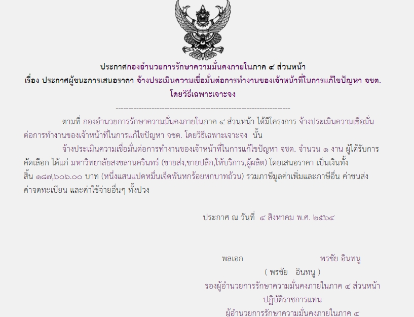 จัดซื้อ จัดจ้างประกาศผู้ชนะการเสนอราคา ประกาศผู้ชนะการเสนอราคา จ้างการประเมินความเชื่อมั่นต่อการทำงานของเจ้าหน้าที่ในการแก้ปัญหา จชต. โดยวิธีเฉพาะเจาะจง ( ๑๘๗,๖๐๖.๐๐ บาท ) August 15, 2021 481 Share Facebook Twitter Google+ Telegram LINE กอ.รมน.ภาค ๔ สน.
