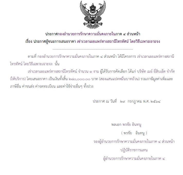 จัดซื้อ จัดจ้างประกาศผู้ชนะการเสนอราคา ประกาศผู้ชนะการเสนอราคา เช่าเวลาเผยแพร่ทางสถานีโทรทัศน์ โดยวิธีเฉพาะเจาะจง ( ๒๘๐,๐๐๐.๐๐ บาท ) August 16, 2021 504 Share Facebook Twitter Google+ Telegram LINE กอ.รมน.ภาค ๔ สน.
