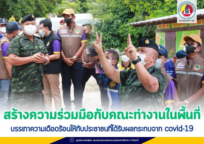 โดยแม่ทัพภาคที่ 4 กล่าวว่า วันนี้ได้มีโอกาสมาเยี่ยมให้กำลังใจพี่น้องประชาชนในพื้นที่ คณะที่ทำงานเพื่อสังคม และเจ้าหน้าที่บุคลากรทางการแพทย์ ตรวจเยี่ยมการเตรียมความพร้อมการจัดตั้งโรงพยาบาลสนามในพื้นที่อำเภอบาเจาะ เพื่อรับฟังปัญหาข้อขัดข้อง และหารือแนวทางให้การสนับสนุน ตลอดจนเป็นสื่อกลางในการประสานเตรียมการ เติมเต็มการปฏิบัติต่างๆให้พร้อมรองรับสถานการณ์ดังกล่าว ที่ผ่านมาจะเห็นได้ว่ามีการประสานการทำงานร่วมกันเพื่อแก้ไขปัญหาในพื้นที่อย่างต่อเนื่อง รวมถึงด้านสถานการณ์การแพร่ระบาดของเชื้อไวรัส covid-19 มีการดำเนินการเชิงรุกถึงความสร้างความเข้าใจให้กับพี่น้องประชาชนในพื้นที่จังหวัดนราธิวาสถึงการปฏิบัติตนตามมาตรการการป้องกันการแพร่ระบาดของเชื้อไวรัส covid-19 ได้ตระหนักรู้ ทำอย่างไรไม่ให้เสี่ยงต่อการแพร่ระบาด เพื่อลดอัตราจำนวนของผู้ติดเชื้อ และแม้จะเกิดสถานการณ์ดังกล่าวขึ้น สิ่งหนึ่งที่เราได้เห็นในพื้นที่คือน้ำใจของพี่น้องคนไทย ไม่ว่าจะภูมิภาคไหน ศาสนาใด น้ำใจของความช่วยเหลือซึ่งกันและกันมีอยู่ทุกหนทุกแห่ง ที่ผ่านมาผู้บัญชาการทหารบกได้มีนโยบายให้ทุกหน่วยในพื้นที่เตรียมความพร้อมเพื่อรองรับสนับสนุนการดำเนินงานด้านต่างๆ อย่างต่อเนื่อง ทั้งอุปกรณ์ เครื่องมือต่าง ๆ และกำลังพล โดยไม่ต้องรอสั่งการ เพื่อดูแลพี่น้องประชาชนเต็มกำลังความสามารถ ขอขอบคุณการทำงานทุกภาคส่วนที่ให้ความช่วยเหลือ สนับสนุน การดำเนินงานต่างๆอย่างต่อเนื่อง สามารถเป็นเครื่องพิสูจน์พลังของความเข้มแข็ง ให้ทุกคนสามารถก้าวข้ามผ่านวิกฤต covid-19 ไปพร้อมกัน