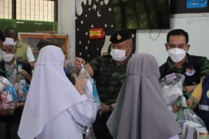 วันนี้ (17 สิงหาคม 2564) เวลา 11.00 น. ที่ โรงเรียนอัตตัรกียะห์อิสลามียะห์ ตำบลบางนาค อำเภอเมือง จังหวัดนราธิวาส พลโท เกรียงไกร ศรีรักษ์ แม่ทัพภาคที่ 4 / ผู้อำนวยการรักษาความมั่นคงภายในภาค 4 เป็นประธานมอบถุงยังชีพให้กับนักเรียนโรงเรียนอัตตัรกียะห์อิสลามียะห์ และพี่น้องประชาชนในพื้นที่ ซึ่งได้รับผลกระทบจากการแพร่ระบาดของเชื้อไวรัส covid-19 โดยดำเนินการภายใต้ความร่วมมือจากกองอำนวยการรักษาความมั่นคงภายในภาค 4 ส่วนหน้า ที่อาศัยกลไกการทำงานจากคณะประสานงานระดับพื้นที่ พร้อมด้วยหน่วยงานต่างๆ ตลอดจนผู้นำท้องที่ ท้องถิ่น ผู้นำศาสนา ร่วมหาแนวทางในการช่วยเหลือแก้ไขปัญหาความเดือดร้อนจากสถานการณ์การแพร่ระบาดของเชื้อไวรัส covid-19 ด้วยการจัดหาสิ่งของอุปโภค-บริโภค ของใช้จำเป็นต่อการดำรงชีพ ให้กับผู้ที่ได้รับผลกระทบโดยตรง ในพื้นที่ต่างๆ ของจังหวัดนราธิวาส