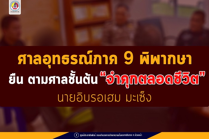 โดยศาลอุทธรณ์ภาค 9 พิพากษา “ยืน” ตามศาลชั้นต้น คือ “จำคุกตลอดชีวิต” นายอิบรอเฮม มะเซ็ง เนื่องจากคดีนี้มีประจักษ์พยานปากสำคัญคือ ภรรยาของผู้ตาย ซึ่งชี้ภาพทะเบียนราษฎรไทย (ทร.14) ของจำเลย (หลังเกิดเหตุ) ว่าเป็นมือปืน และต่อมาอีก 5 ปี ก็ยังชี้ตัวจำเลยตัวจริง (หลังจากจับกุมตัวได้) อย่างถูกต้อง ประกอบกับคำให้การระหว่างก่อเหตุสอดคล้องกับคำสารภาพของจำเลยในชั้นซักถาม อีกด้วย