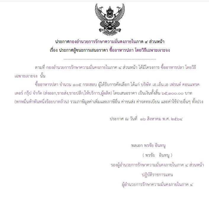 ประกาศผู้ชนะการเสนอราคา ซื้ออาหารปลา โดยวิธีเฉพาะเจาะจง ( ๖๕,๑๐๐.๐๐ บาท )