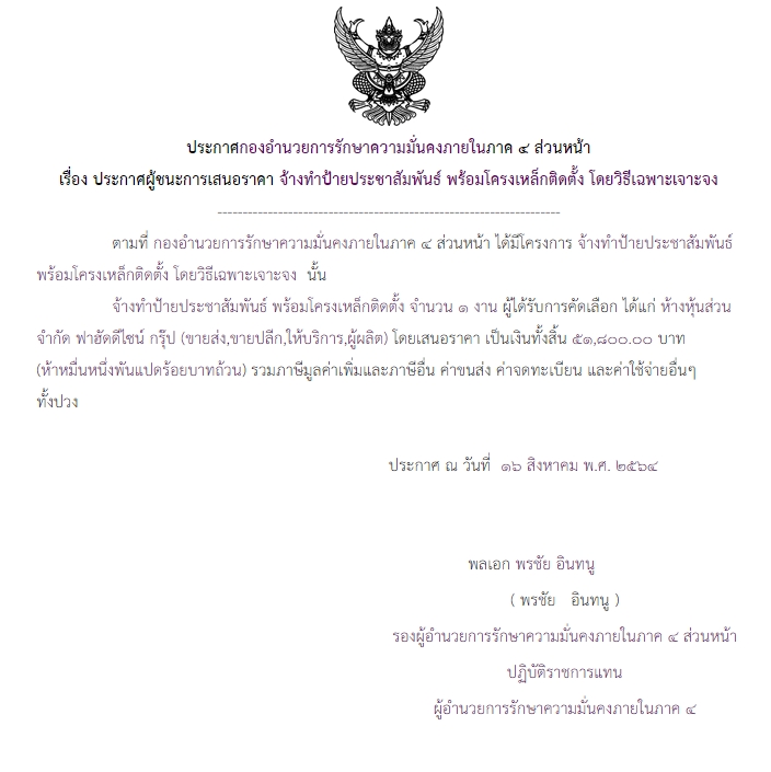 ประกาศผู้ชนะการเสนอราคา จ้างทำป้ายประชาสัมพันธ์ พร้อมโครงเหล็กติดตั้ง โดยวิธีเฉพาะเจาะจง ( ๕๑,๘๐๐.๐๐ บาท )