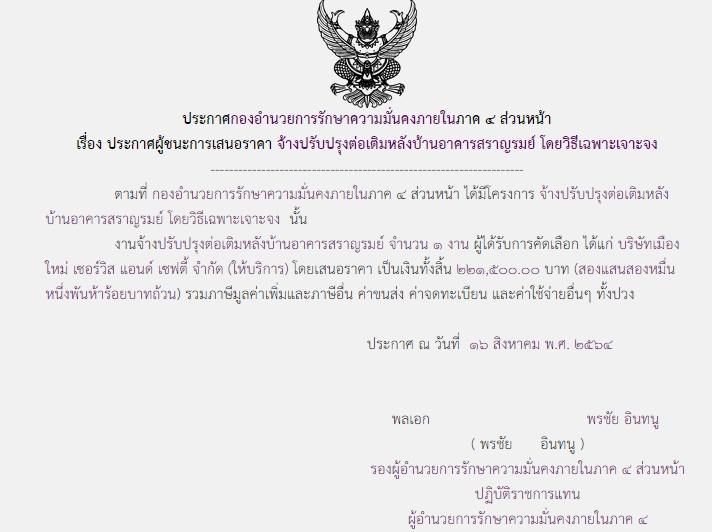 จัดซื้อ จัดจ้างประกาศผู้ชนะการเสนอราคา ประกาศผู้ชนะการเสนอราคา จ้างปรับปรุงต่อเติมหลังบ้านอาคารสราญรมย์ โดยวิธีเฉพาะเจาะจง ( ๒๒๑,๕๐๐.๐๐ บาท ) August 18, 2021 526 Share Facebook Twitter Google+ Telegram LINE กอ.รมน.ภาค ๔ สน.