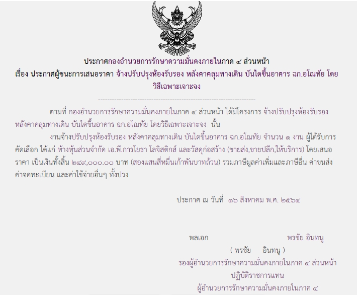 จัดซื้อ จัดจ้างประกาศผู้ชนะการเสนอราคา ประกาศผู้ชนะการเสนอราคา จ้างปรับปรุงห้องรับรอง หลังคาคลุมทางเดิน บันไดขึ้นอาคาร ฉก.อโณทัย โดยวิธีเฉพาะเจาะจง ( ๒๔๙,๐๐๐.๐๐ บาท ) August 18, 2021 584 Share Facebook Twitter Google+ Telegram LINE กอ.รมน.ภาค ๔ สน.