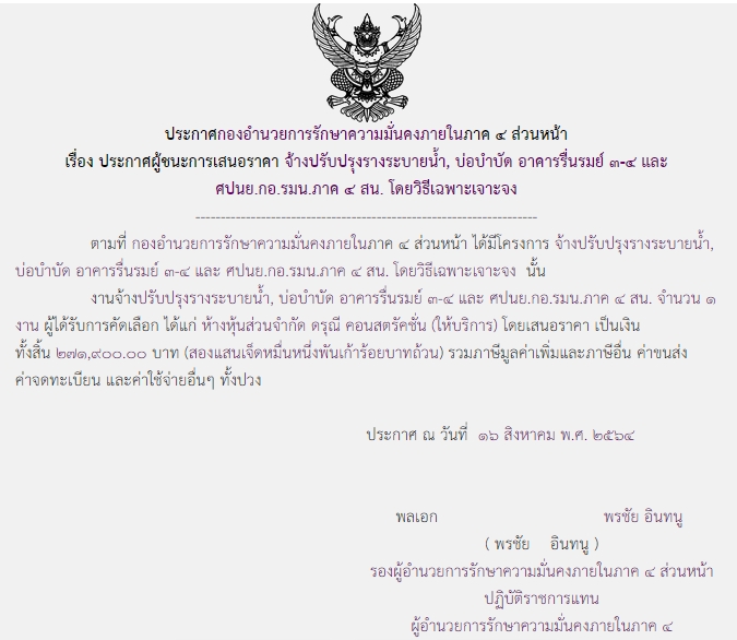 ประกาศผู้ชนะการเสนอราคา จ้างปรับปรุงรางระบายน้ำ, บ่อบำบัด อาคารรื่นรมย์ ๓ – ๔ และ ศปนย.กอ.รมน.ภาค ๔ สน. โดยวิธีเฉพาะเจาะจง ( ๒๗๑,๙๐๐.๐๐ บาท )