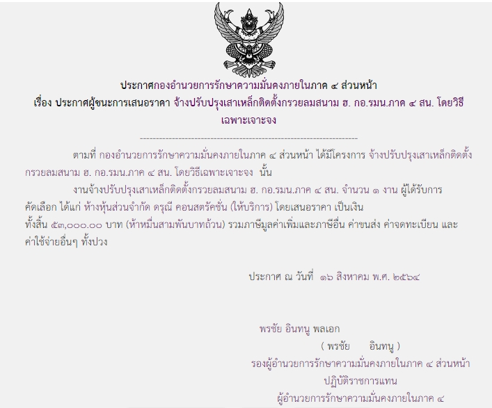 ประกาศผู้ชนะการเสนอราคา จ้างปรับปรุงเสาเหล็กติดตั้งกรวยลมสนาม ฮ. กอ.รมน.ภาค ๔ สน. โดยวิธีเฉพาะเจาะจง ( ๕๓,๐๐๐.๐๐ บาท )