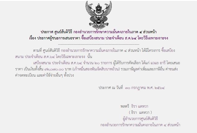 ประกาศผู้ชนะการเสนอราคา ซื้อเสบียงสนาม ประจำเดือน ส.ค.๖๔ โดยวิธีเฉพาะเจาะจง ( ๙๒,๐๗๐.๐๐ บาท )